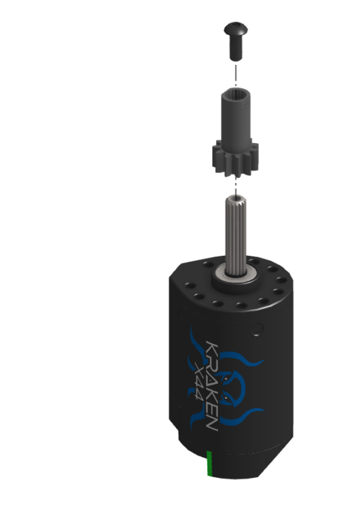 Coloque a engrenagem de pinhão de direção no eixo do motor Kraken X44 e, em seguida, fixe-a com um parafuso button head 10-32 x 3/8” (o encaixe da chave é T25, não hexagonal de 1/8”).