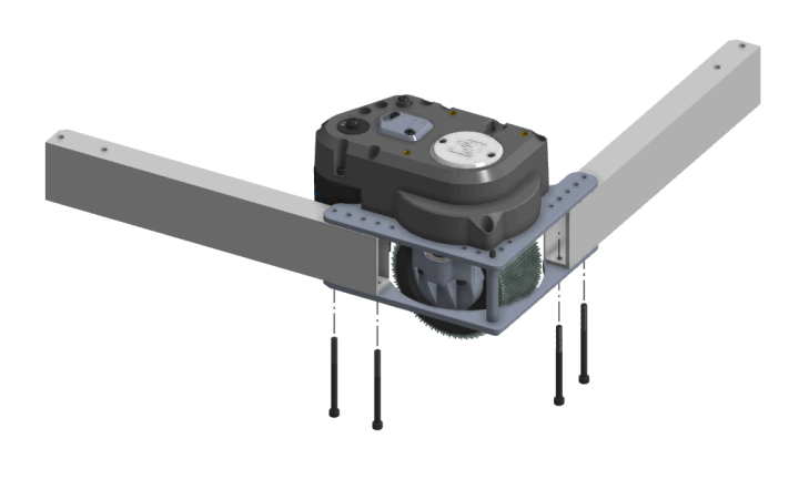 O módulo swerve normalmente é montado em tubos retangulares de 2” x 1” utilizando quatro parafusos allen 10-32 x 2,5”.