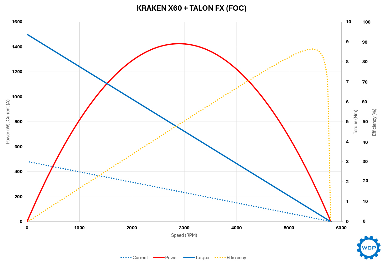 Para total transparência, as equipes não poderão usar toda a potência máxima do Kraken em um robô da FRC. Isso ocorre porque cada motor é limitado por um disjuntor de 40A, e o motor precisa de mais de quatro vezes essa corrente para produzir a potência máxima do Kraken. No entanto, uma potência máxima maior ainda é importante no contexto de um robô da FRC por dois motivos principais: