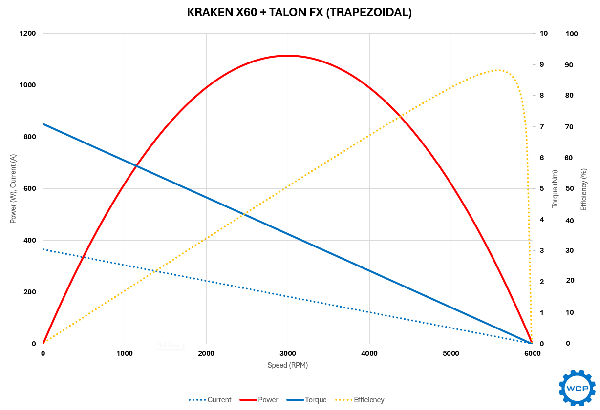 Ao apresentar uma potência de pico mais alta, o Kraken consegue operar em um ponto mais estratégico da curva de potência durante uma partida da FRC. Isso permite que o motor funcione com maior eficiência, o que significa que menos energia elétrica é convertida em calor, permitindo que ele funcione por mais tempo antes de sofrer danos permanentes nos enrolamentos.