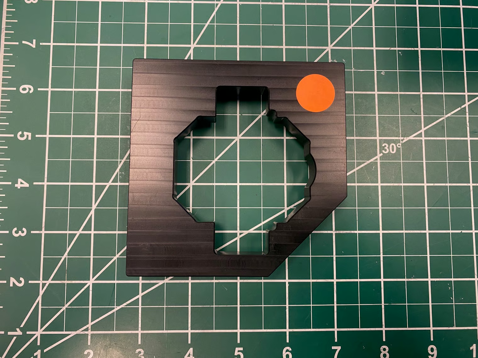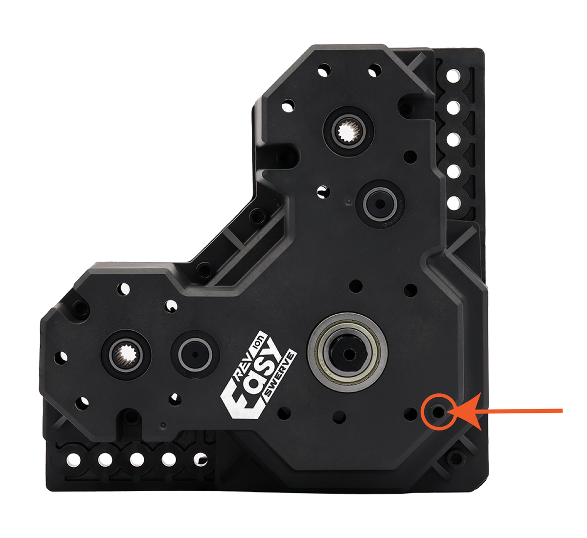 - A roda MAXSwerve só encaixa em uma orientação devido à posição da engrenagem cônica. A ferramenta de calibração não é simétrica, portanto, você precisará alinhar a engrenagem cônica com o lado do recorte indicado pelo ponto laranja nesta imagem.