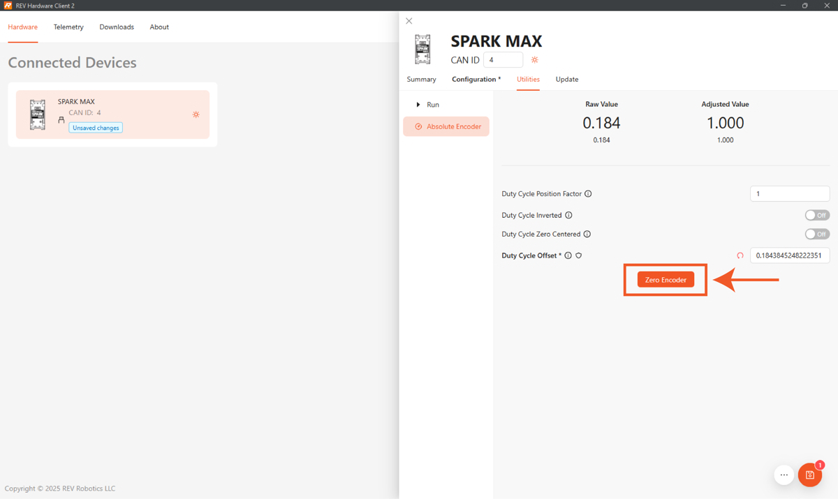 - Certifique-se de que o SPARK de direção ainda esteja selecionado e, em seguida, acesse Encoder Absoluto na guia Utilitários.