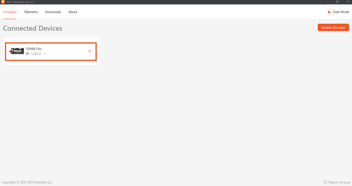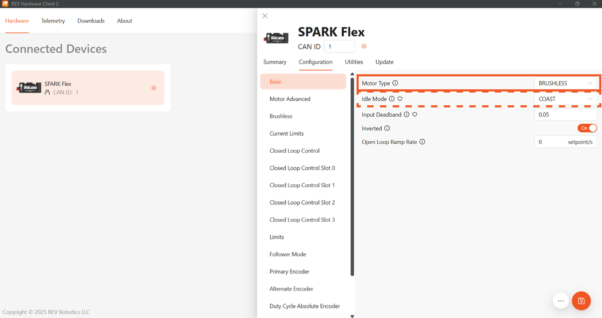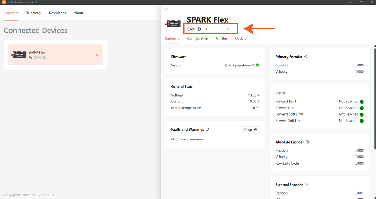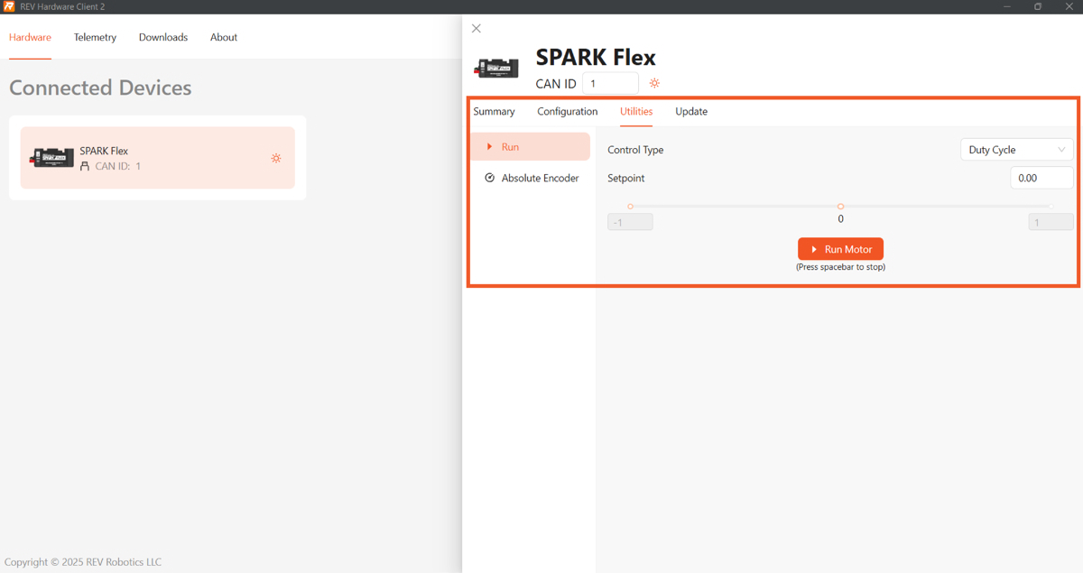 Mantenha o cabo CAN desconectado durante todo o teste. Por motivos de segurança, o REV Hardware Client não acionará o motor se o roboRIO estiver conectado. Se o roboRIO estiver conectado, reinicie o SPARK Flex.