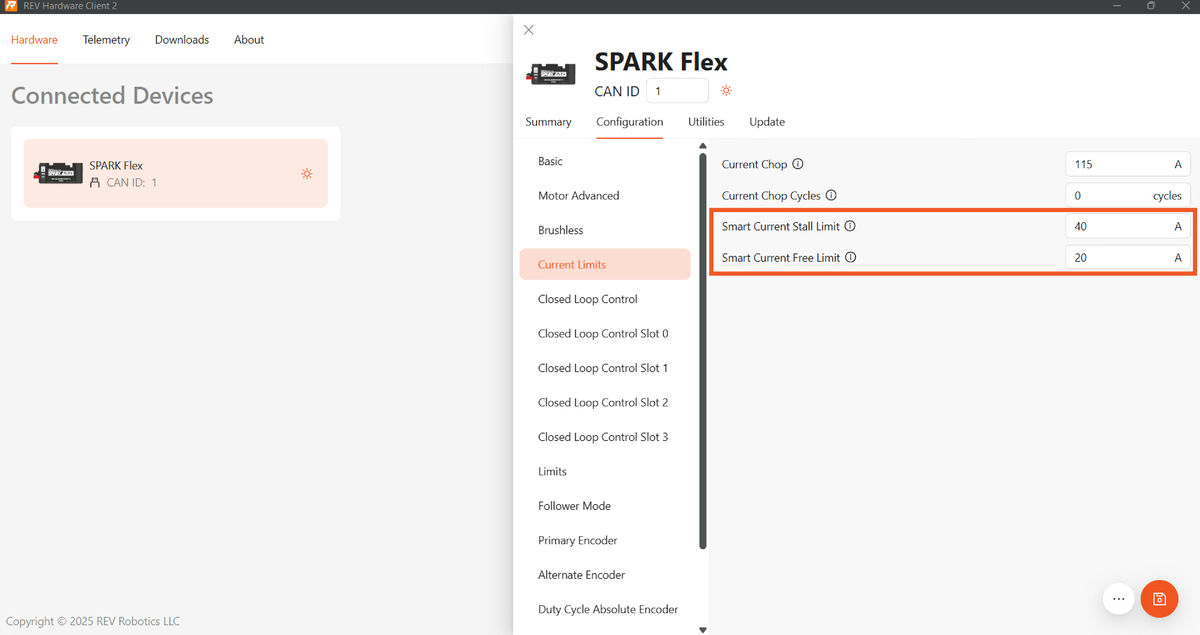 Lembre-se de que algumas configurações, como o Limite Inteligente de Corrente, devem ser gravadas na memória flash por meio de código ou do Hardware Client para serem mantidas após um ciclo de energia do SPARK Flex.