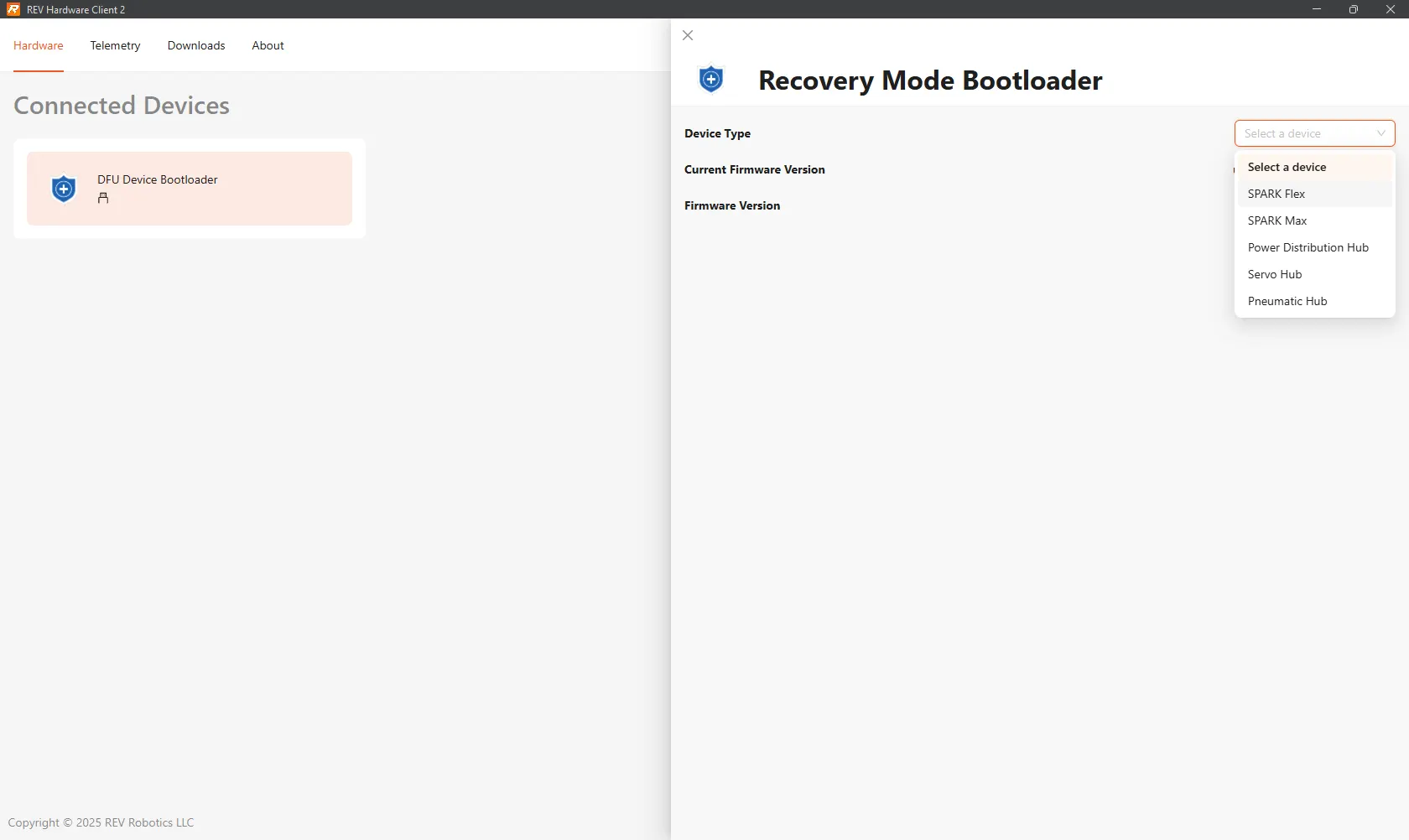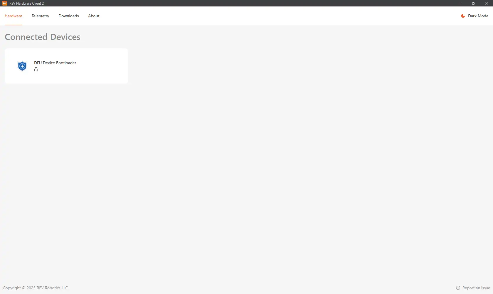 - Selecione o Bootloader do Dispositivo DFU na lista de Dispositivos Conectados na janela do REV Hardware Client 2.