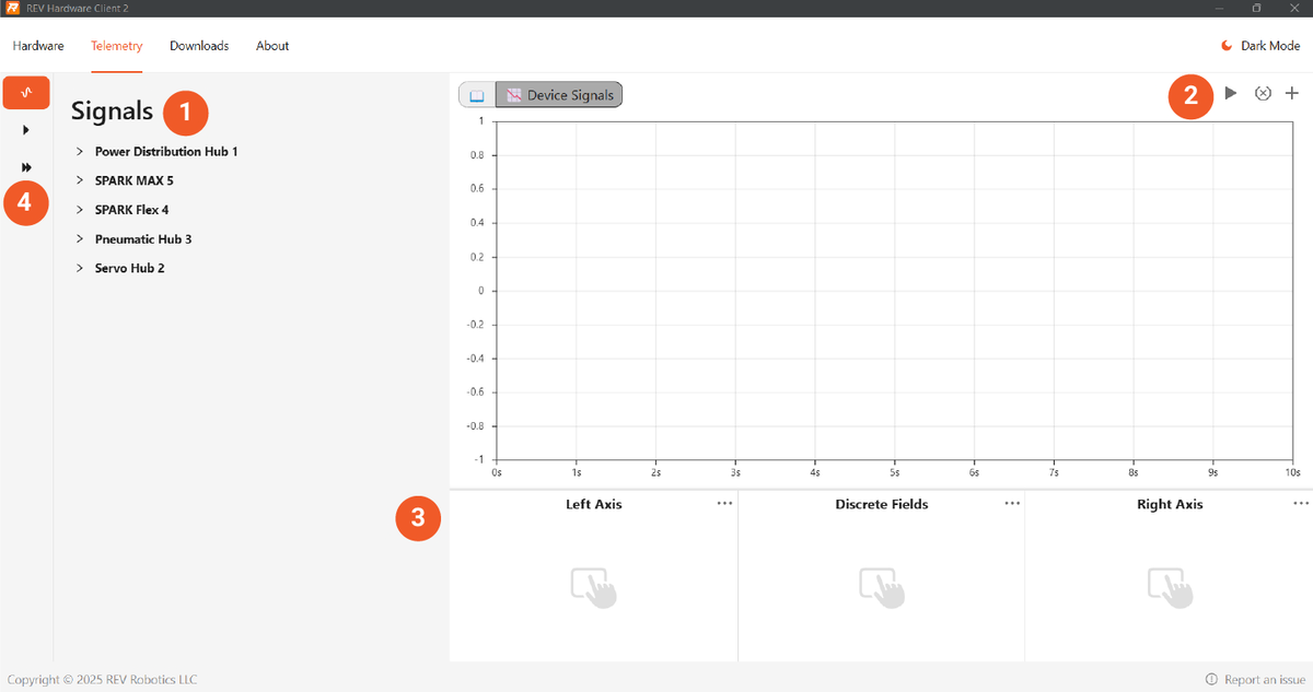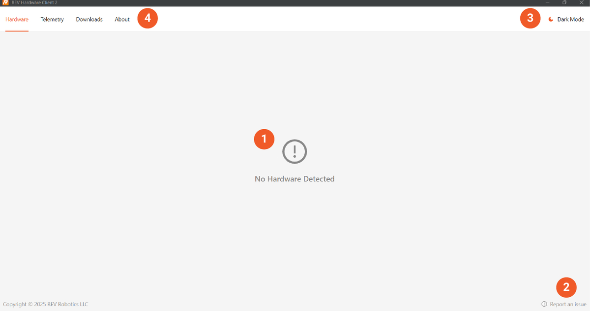 - Navegação - Quatro abas estão localizadas na parte superior do REV Hardware Client, permitindo que você navegue pelas diferentes funcionalidades.
