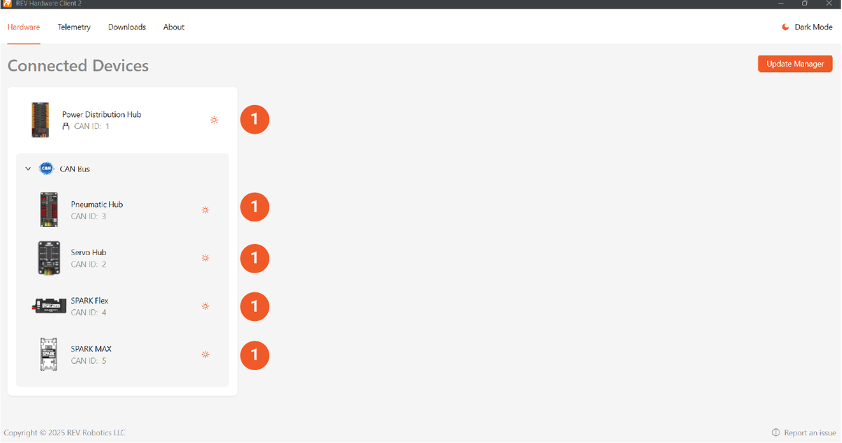 Conectar o hardware compatível a um PC com Windows e com o REV Hardware Client em execução fará com que os dispositivos sejam automaticamente detectados e adicionados à guia Hardware.