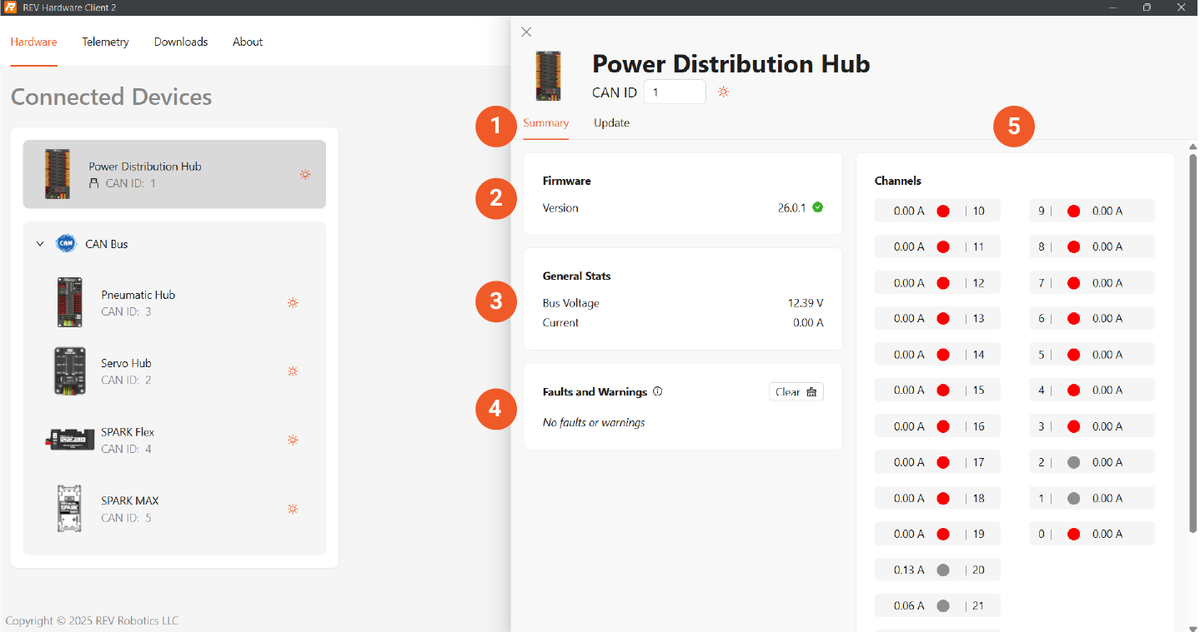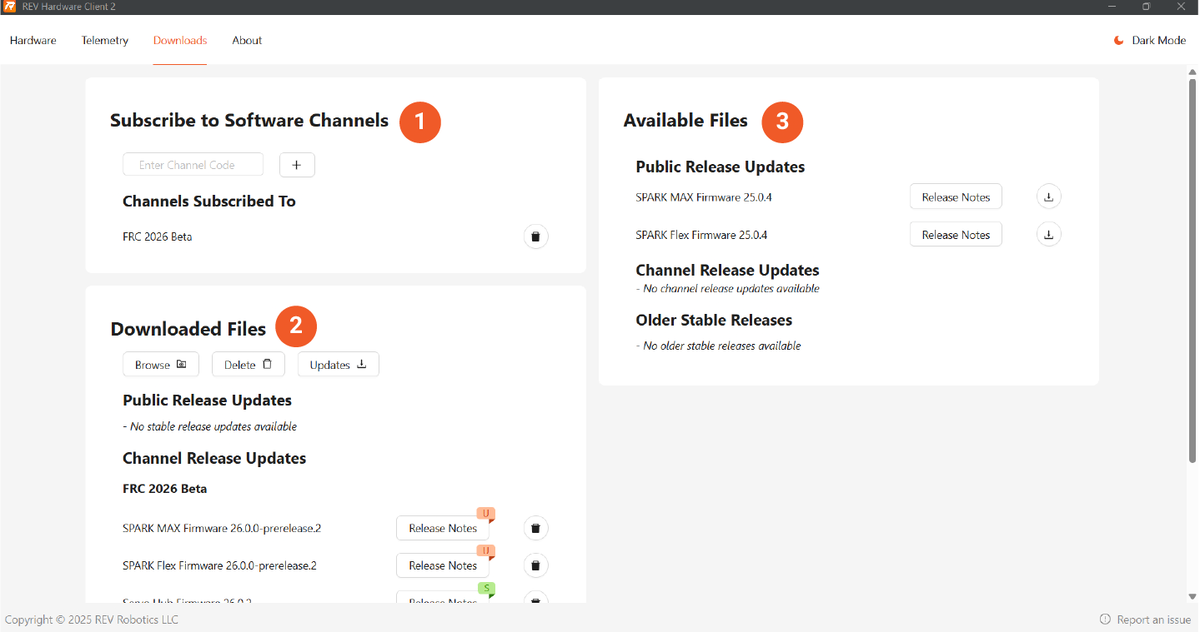 A aba Downloads é onde os arquivos de software baixados são gerenciados. As atualizações de software mais recentes podem ser baixadas sem que um dispositivo de hardware esteja conectado ao REV Hardware Client.